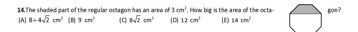 Q14. The shaded part of the regular octagon has an area of 3 cm . How big is the area of the oct a- gon?