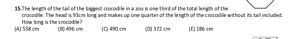 Q15. The length of the tail of the biggest crocodile in a zoo is one third of the total length of the crocodile. The head is 93cm long and makes up one quarter of the length of the crocodile without its tail included. How long is the crocodile?