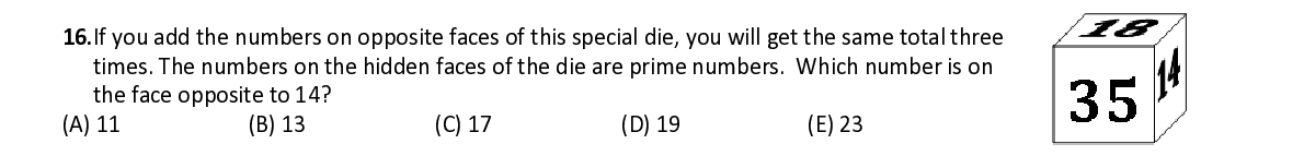 Q16. If you add the numbers on opposite faces of this special die, you will get the same total three times. The numbers on the hidden faces of the die are prime numbers. Which number is on the face opposite to 14?