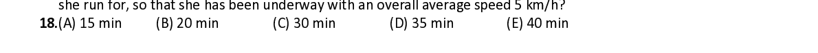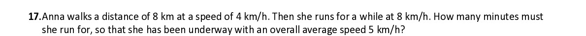 Q17. Anna walks a distance of 8 km at a speed of 4 km/h. Then she runs for a while at 8 km/h. How many minutes must she run for, so that she has been underway with an overall average speed 5 km/h?