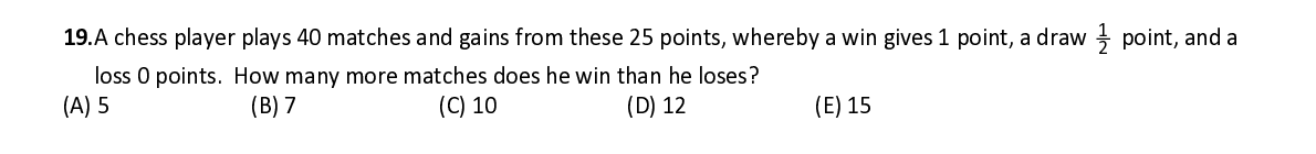 Q19. A chess player plays 40 matches and gains from these 25 points, whereby a win gives 1 point, a draw 1 point, and a 2 loss 0 points. How many more matches does he win than he loses?