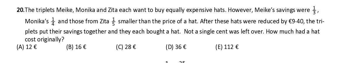 Q20. The triplets Meike, Monika and Zita each want to buy equally expensive hats. However, Meike’s savings were 1 , 3 Monika’s 1 and those from Zita 1 5 smaller than the price of a hat. After these hats were reduced by €9 ⋅ 40, the tr i- 4 plets put their savings together and they each bought a hat. Not a single cent was left over. How much had a hat cost originally?