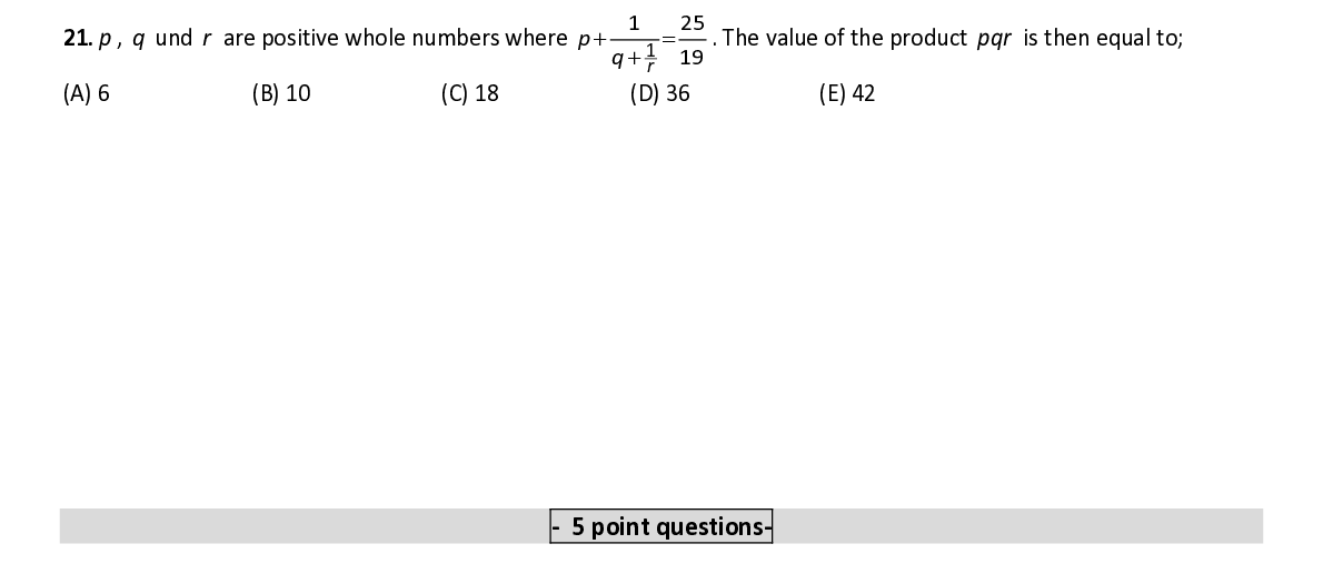 Q21. p , q und r are positive whole numbers where p += . The value of the product pqr is then equal to; q + 1 19 r