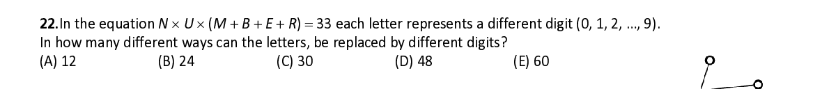 Q22. In the equation N × U × ( M + B + E + R ) = 33 each letter represents a different digit (0, 1, 2, …, 9) . In how many different ways can the letters, be replaced by different digits?