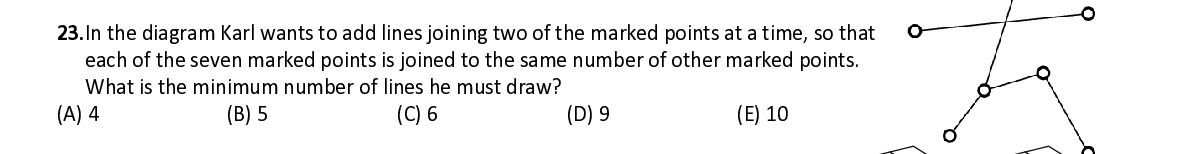 Q23. In the diagram Karl wants to add lines joining two of the marked points at a time, so that each of the seven marked points is joined to the same number of other marked points. What is the minimum number of lines he must draw?