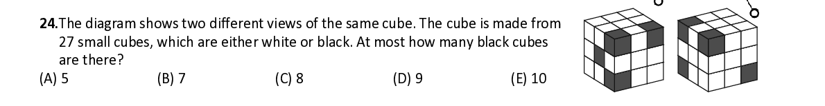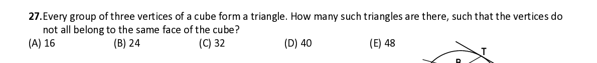 Q27. Every group of three vertices of a cube form a triangle. How many such triangles are there, such that the vertice s do not all belong to the same face of the cube?