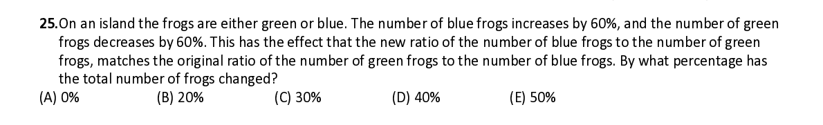 Q25. On an island the frogs are either green or blue. The number of blue frogs increases by 60%, and the number of green frogs decreases by 60%. This has the effect that the new ratio of the number of blue frogs to the number of green frogs, matches the origina l ratio of the number of green frogs to the number of blue frogs. By what percentage has the total number of frogs changed?