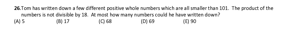 Q26. Tom has written down a few different positive whole numbers which are all smaller than 101. The product of the numbers is not divisible by 18. At most how many numbers could he have written down?