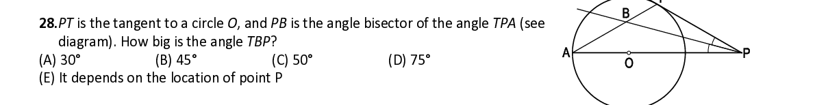 Q28. PT is the tangent to a circle O , and PB is the angle bisector of the angle TPA (see diagram). How big is the angle TBP ?