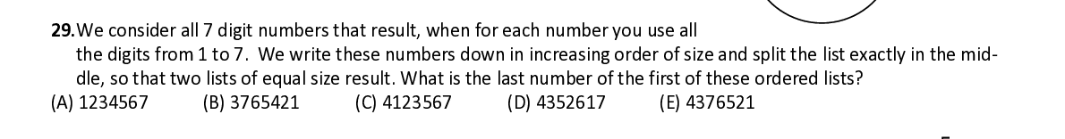 Q29. We consider all 7 digit numbers that result, when for each number you use all the digits from 1 to 7. We write these numbers down in increasing order of size and split the list exactly in the mi d- dle, so that two lists of equal size result. What is the last number of the first of these ordered lists?