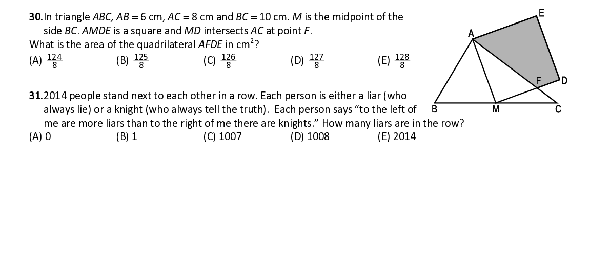 Q30. In triangle ABC, AB = 6 cm, AC = 8 cm and BC = 10 cm. M is the midpoint of the side BC . AMDE is a square and MD intersects AC at point F . 2 What is the area of the quadrilateral AFDE in cm ?