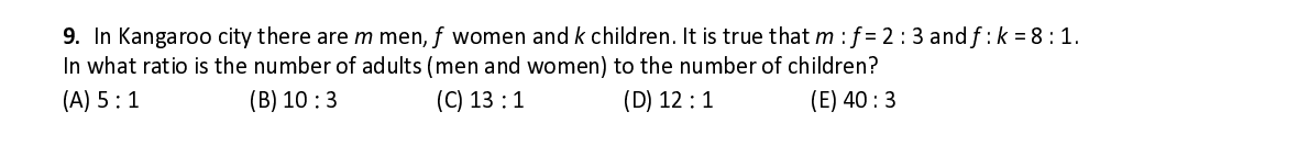 Q9. In Kangaroo city there are m men, f women and k children. It is true that m : f = 2 : 3 and f : k = 8 : 1. In what ratio is the number of adults (men and women) to the number of children?