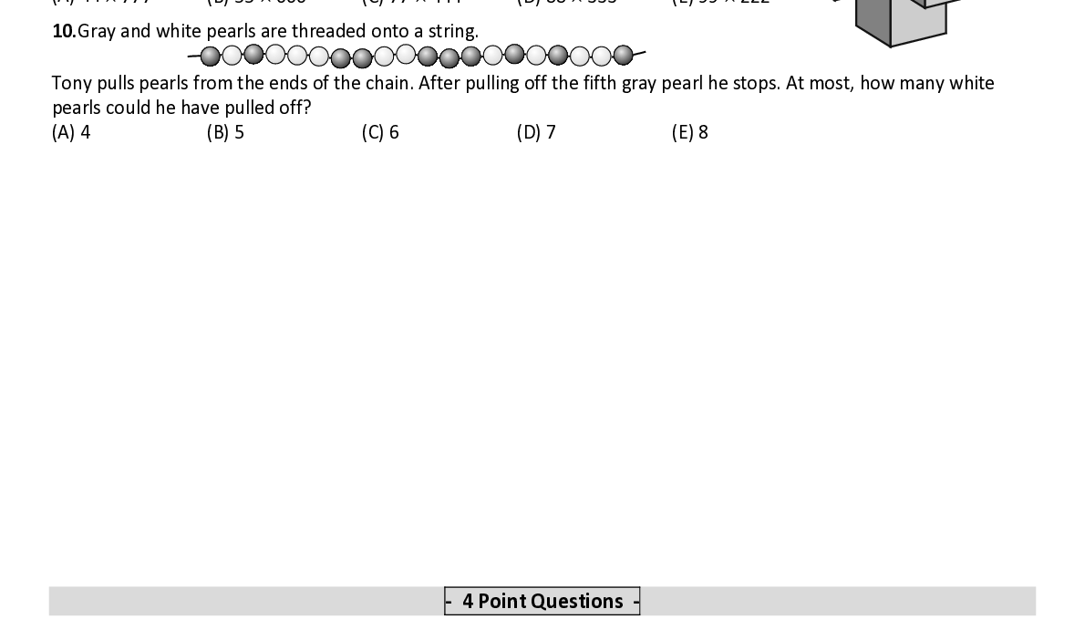 Q10. Gray and white pearls are threaded onto a string. Tony pulls pearls from the ends of the chain. After pulling off the fifth gray pearl he stops. At most, how many white pearls could he have pulled off?