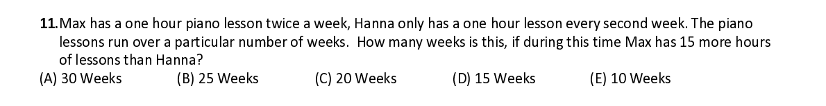 Q11. Max has a one hour piano lesson twice a week, Hanna only has a one hour lesson every second week. The piano lessons run over a particular number of weeks. How many weeks is this, if during this time Max has 15 more hours of lessons than Hann a?