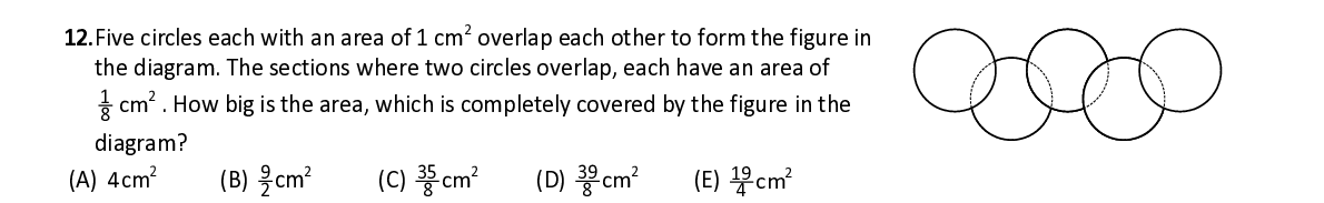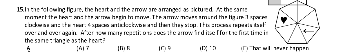 Q15. In the following figure, the heart and the arrow are arranged as pictured. At th e same moment the heart and the arrow begin to move. The arrow moves around the figure 3 spaces clockwise and the heart 4 spaces anticlockwise and then they stop. This process repeats itself over and over again. After how many repetitions does the arrow f ind itself for the first time in the same triangle as the heart?