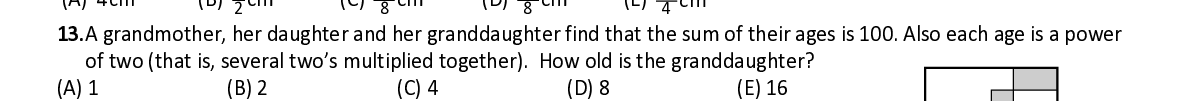 Q13. A grandmother, her daughter and her granddaughter find that the sum of their ages is 100. Also each age is a power of two (that is, several two’s multiplied together). How old is the granddaughter?