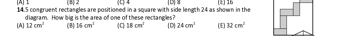 Q14. 5 congruent rectangles ar e positioned in a square with side length 24 as shown in the diagram. How big is the area of one of these rectangles?