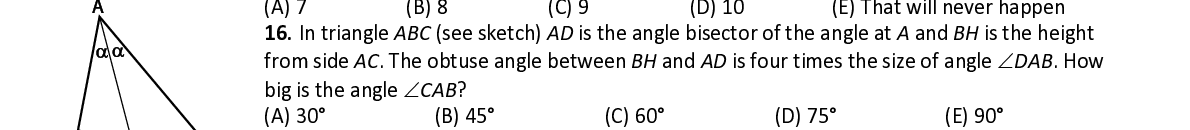 Q16. In triangle ABC (see sketch) AD is the angle bisector of the angle at A and BH is the height from side AC . The obtuse angle between BH an d AD is four times the size of angle ∠ DAB . How big is the angle ∠ CAB ?