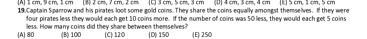 Q19. Captain Sparrow and his pirates loot some gold coins. They share the coins equally amongst themselves. If they were four pirates less they would each get 10 coins more. If the number of coins was 50 le ss, they would each get 5 coins less. How many coins did they share between themselves?