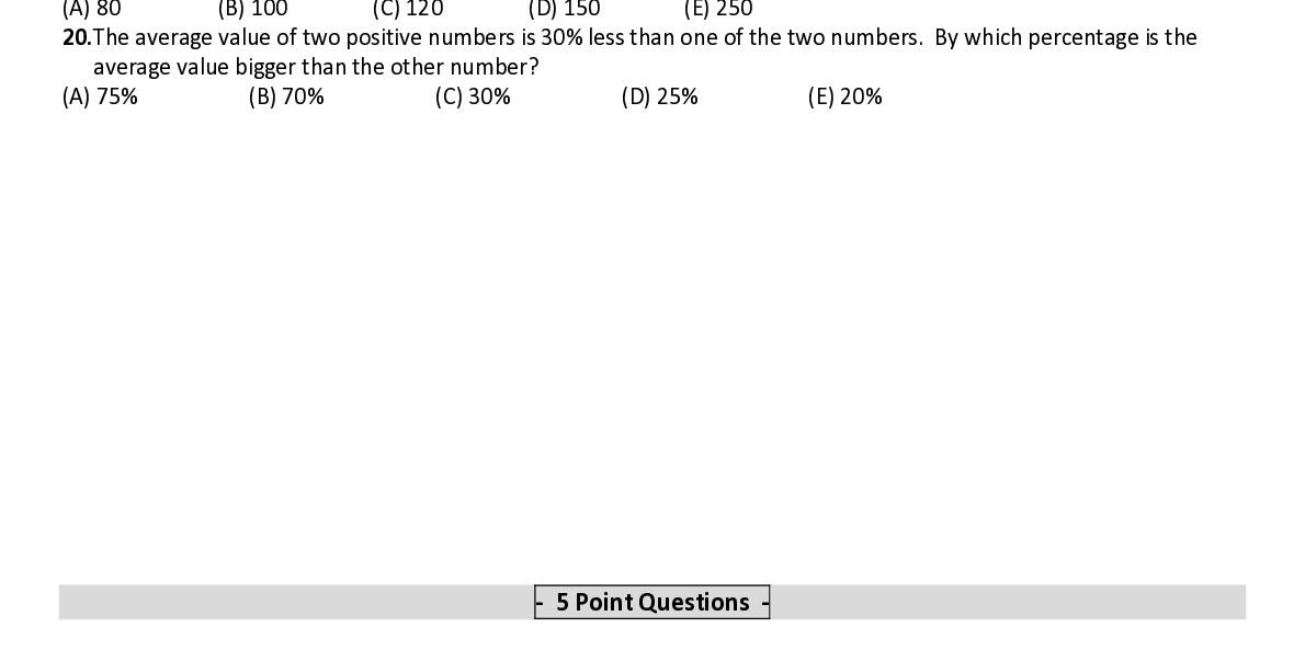 Q20. The average value of two positive numbers is 30% less than one of the two numbers. By which percentage is the average value big ger than the other number?