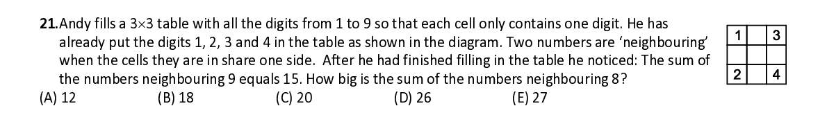 Q21. Andy fills a 3 × 3 table with all the digits from 1 to 9 so that each cell only contains one digit. He has already put the digits 1, 2, 3 and 4 in the table as shown in the diagram. Two numbers are ‘neighbouring’ when the cells they are in share one side. After he had fin ished filling in the table he noticed: The sum of the numbers neighbouring 9 equals 15. How big is the sum of the numbers neighbouring 8?