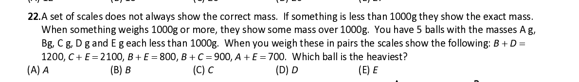 Q12. , C + E = 2100, B + E = 800, B + C = 900, A + E = 700. Which ball is the heaviest?
