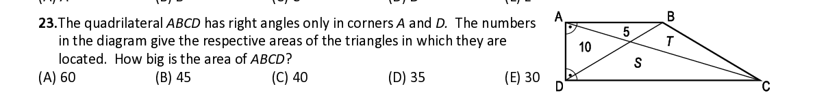 Q23. The quadrilateral ABCD has right angles only in corners A and D. The numbers in the diagram give the respective areas of the triangles in which they are located. How big is the area of ABCD ?