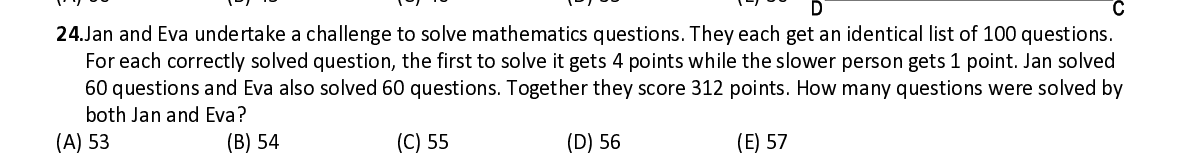 Q24. Jan and Eva undertake a challenge to solve mathematics questions. They each get an id entical list of 100 questions. For each correctly solved question, the first to solve it gets 4 points while the slower person gets 1 point. Jan solved 60 questions and Eva also solved 60 questions. Together they score 312 points. How many questions were s olved by both Jan and Eva?