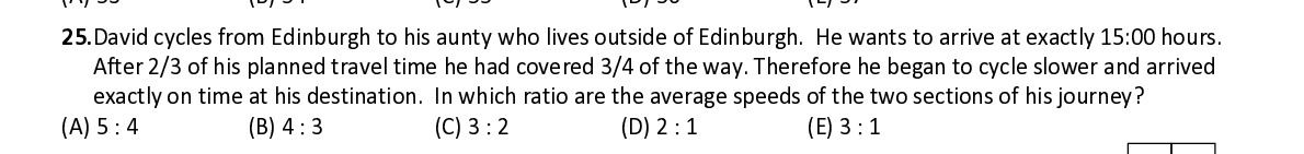 Q25. David cycles from Edinburgh to his aunty who lives outside of Edinburgh. He wants to arrive at exactly 15:00 hours. After 2/3 of his planned travel time he had covered 3/4 of the way. There fore he began to cycle slower and arrived exactly on time at his destination. In which ratio are the average speeds of the two sections of his journey?