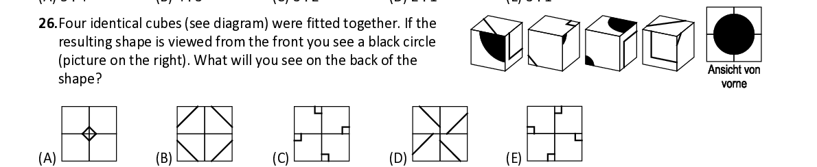 Q26. Four identical cubes (see diagram) were fitted to gether. If the resulting shape is viewed from the front you see a black circle (picture on the right). What will you see on the back of the shape?