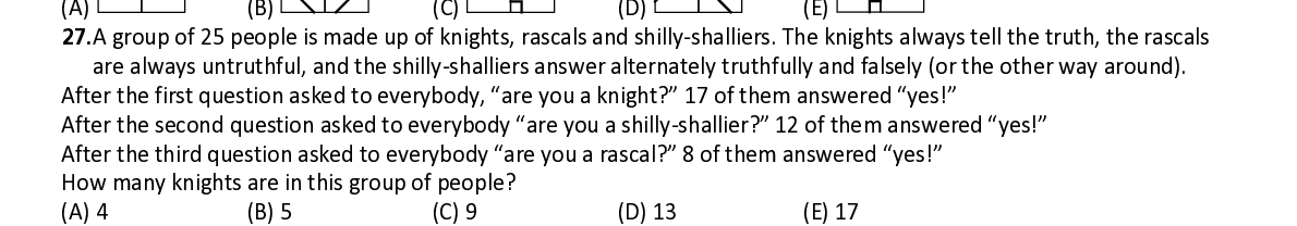 Q27. A group of 25 people is made up of knights, rascals and shilly - shalliers. The knights always tell the truth, the rascals are always untruthful, and the shilly - shalliers answer alternately truthfully and falsely (or the other way around). After the first question asked to everybody, “are you a knight?” 17 of them answered “yes!” After the second question asked to everybody “are you a shilly - shallier?” 12 of them answered “yes!” After the third question asked to everybody “are you a rascal?” 8 of them answered “yes!” How many knights are in this group of people?