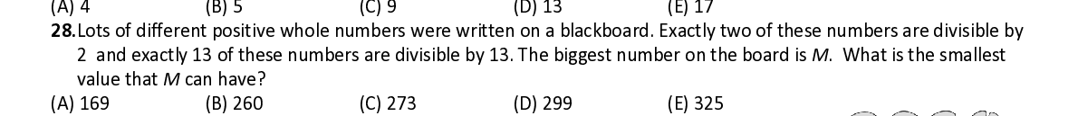 Q2. and exactly 13 of these numbers are divisible by 13. The biggest number on the board is M . What is the smallest value that M can have?