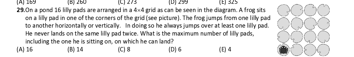 Q29. On a pond 16 lilly pads are arranged in a 4 × 4 grid as can be seen in the diagram. A frog sits on a lilly pad in one of the corners of the grid (see picture). The frog jumps from one lilly pad to anothe r horizontally or vertically. In doing so he always jumps over at least one lilly pad. He never lands on the same lilly pad twice. What is the maximum number of lilly pads, including the one he is sitting on, on which he can land?