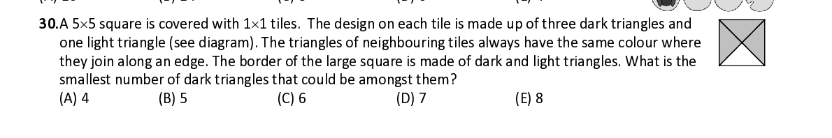 Q30. A 5 × 5 square is covered with 1 × 1 tiles. The design on each tile is made up of three dark triangles and one light triangle (see diagram). The triangles of neighbouring tiles always have the same colour where they join along an edge. The border of the large square is made of dark and light triangles. What is the smallest number of dark triangles that could be amongst them?