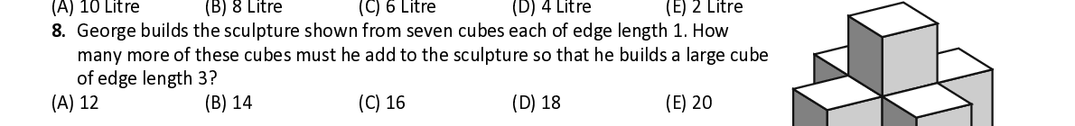 Q8. George builds the sculpture shown from seven cubes each of edge length 1. How many more of these cubes must he add to the sculpture so that he builds a large cube of edge length 3?