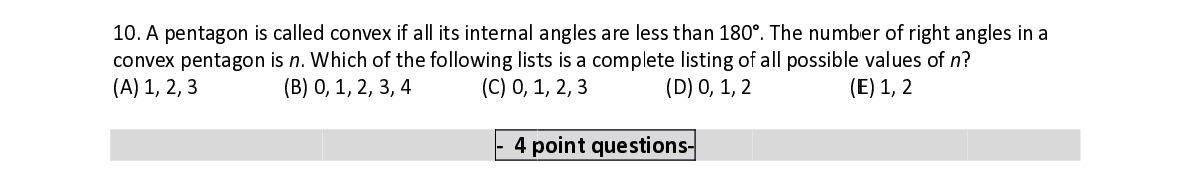 Q10. A penta gon is calle d d convex if al l its internal angles are l e e ss than 180 ° ° . The numb b er of right a n n gles in a convex pen t t agon is n . W W hich of the following lis t t s is a compl ete listing o f f all possible values of n ? ?