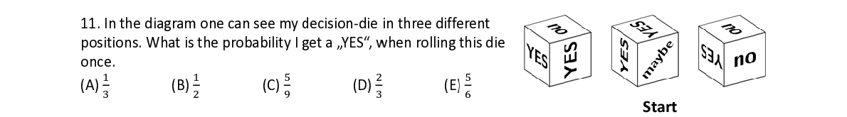Q11. In the d iagram one c c an see my d d ecision ‐ die i in three diff e e rent positions. W W hat is the p p robability I g g et a „YES“, w w hen rolling t his die once. ଵ ଵ ହ ଶ ହ
