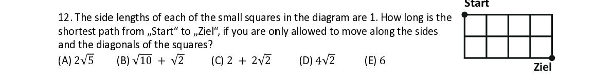 Q12. The sid e e lengths of e e ach of the s s mall square s s in the diag ram are 1. H ow long is t h h e shortest pa t t h from „Sta rt“ to „Ziel“, if you are o n n ly allowed t t o move alo n n g the sides and the dia g g onals of th e e squares?