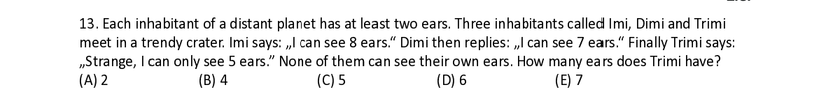 Q13. Each in h h abitant of a distant pla n n et has at le a a st two ears. Three inha b b itants calle d d Imi, Dimi a n n d Trimi meet in a t r r endy crater. Imi says: „I c c an see 8 ea rs.“ Dimi th e e n replies: „I can see 7 ea a rs.“ Finally T T rimi says: „Strange, I c c an only see 5 ears.” No n n e of them c a a n see their own ears. H o w many ea rs does Trim i have?