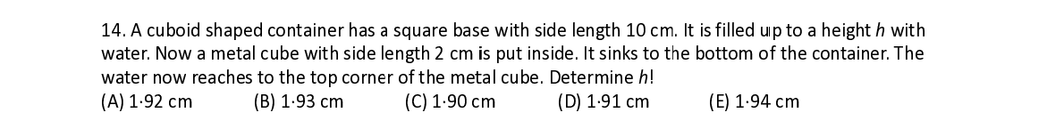Q14. A cuboi d d shaped co n n tainer has a a square bas e e with side l e e ngth 10 cm . It is filled u u p to a heigh t h with water. Now a metal cu b b e with side l ength 2 cm i i s put inside . . It sinks to t h h e bottom o f f the contai n n er. The water now reaches to t h h e top corn e e r of the me t t al cube. Det ermine h !