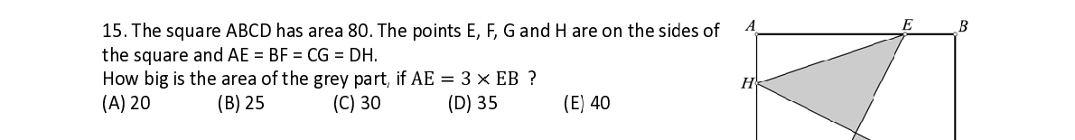 Q15. The squ are ABCD h a a s area 80. T h e points E, F, G and H a r r e on the si d es of the square a a nd AE = BF = CG = DH. How big is t t he area of t h h e grey part , , if AE ൌ 3 ൈ ൈ EB ?