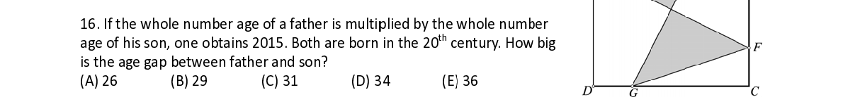 Q16. If the w hole numbe r age of a fa t t her is multi p p lied by the w w hole num b b er th age of his s o o n, one obt a a ins 2015. B o o th are born in the 20 c entury. Ho w big is the age g a a p between father and s on?