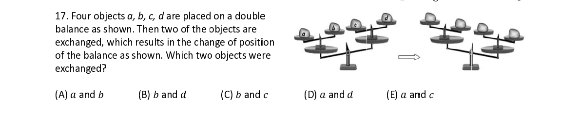 Q17. Four ob j j ects a, b, c, d are place d d on a doubl e e balance as s s hown. The n n two of the o o bjects are exchanged, which resul t t s in the cha nge of posit i i on of the bala n n ce as show n n . Which tw o o objects we re exchanged ? ?