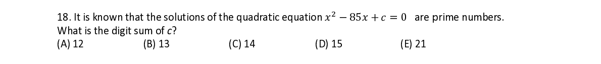 Q18. It is kno wn that the solutions of the quadrat t ic equation ݔ ݔ െ85ݔ ܿൌ0 are p p rime numb e e rs. What is the digit sum o f f c ?