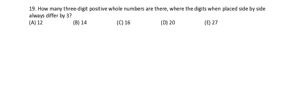 Q19. How m a a ny three ‐ di g g it positive w w hole numb e e rs are ther e e , where the digits when placed side by side always diff e e r by 3?