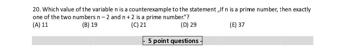 Q20. Which v v alue of the v v ariable n is a counterex a a mple to th e e statement „ „ If n is a pri m m e number, t t hen exactly one of the t t wo number s s n – 2 and n n + 2 is a pri m m e number.“ ? ?