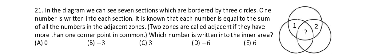 Q21. In the d iagram we c a a n see seve n n sections w h h ich are bor d d ered by thr e e e circles. O n ne number is w w ritten into e e ach section . It is known that each n u u mber is eq u u al to the su m m of all the n u u mbers in th e adjacent z o o nes. (Two z ones are cal led adjacen t if they have e more than o o ne corner p p oint in com m m on.) Whic h h number is w w ritten into t t he inner ar e e a?