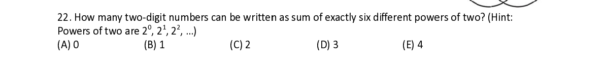 Q22. How m a a ny two ‐ digi t t numbers c a a n be writte n n as sum of e e xactly six di f f ferent pow e e rs of two? ( Hint: 0 1 1 2 Powers of t w w o are 2 , 2 , 2 , …)