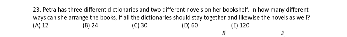 Q23. Petra h a a s three diff e e rent diction aries and t w w o different n n ovels on he r bookshelf. In how man y y different ways can s h h e arrange t h h e books, if a a ll the dictio n n aries shoul d d stay toget h h er and like w w ise the nov e e ls as well?
