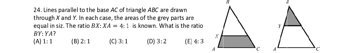 Q24. Lines p a a rallel to the base AC of t t riangle ABC are drawn through X a nd Y . In eac h h case, the a reas of the g g rey parts ar e e equal in siz . . The ratio ܤ ܺ ܺ :ܺܣൌ4: 1 1 is known. W W hat is the ratio ܤܻ:ܻܣ ?